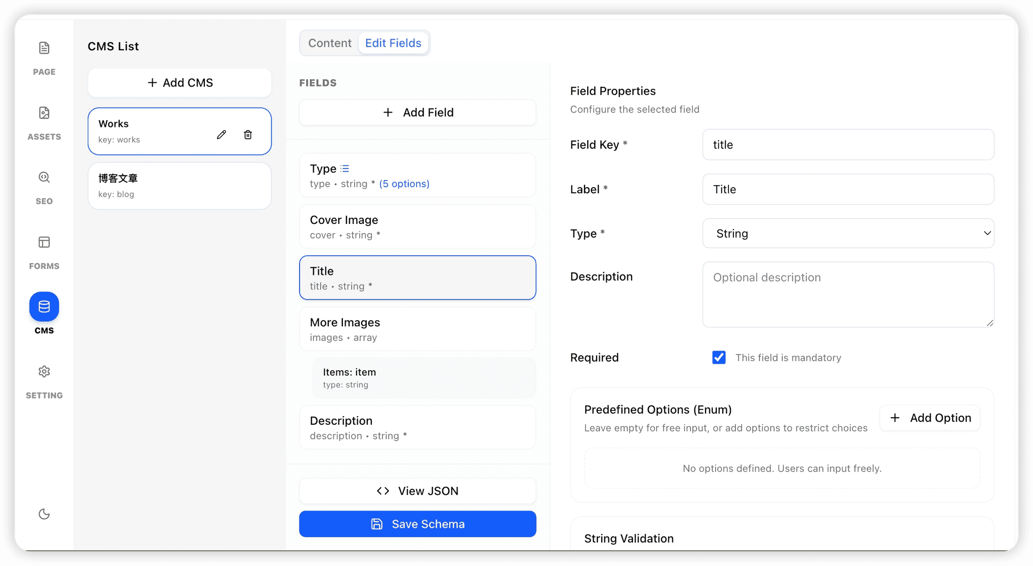 常见字段包括:标题、描述、分类(Web / UI / UX 等)、封面图、内容、更多图片(数量不固定)