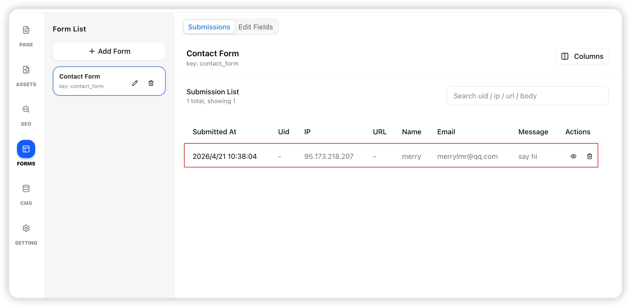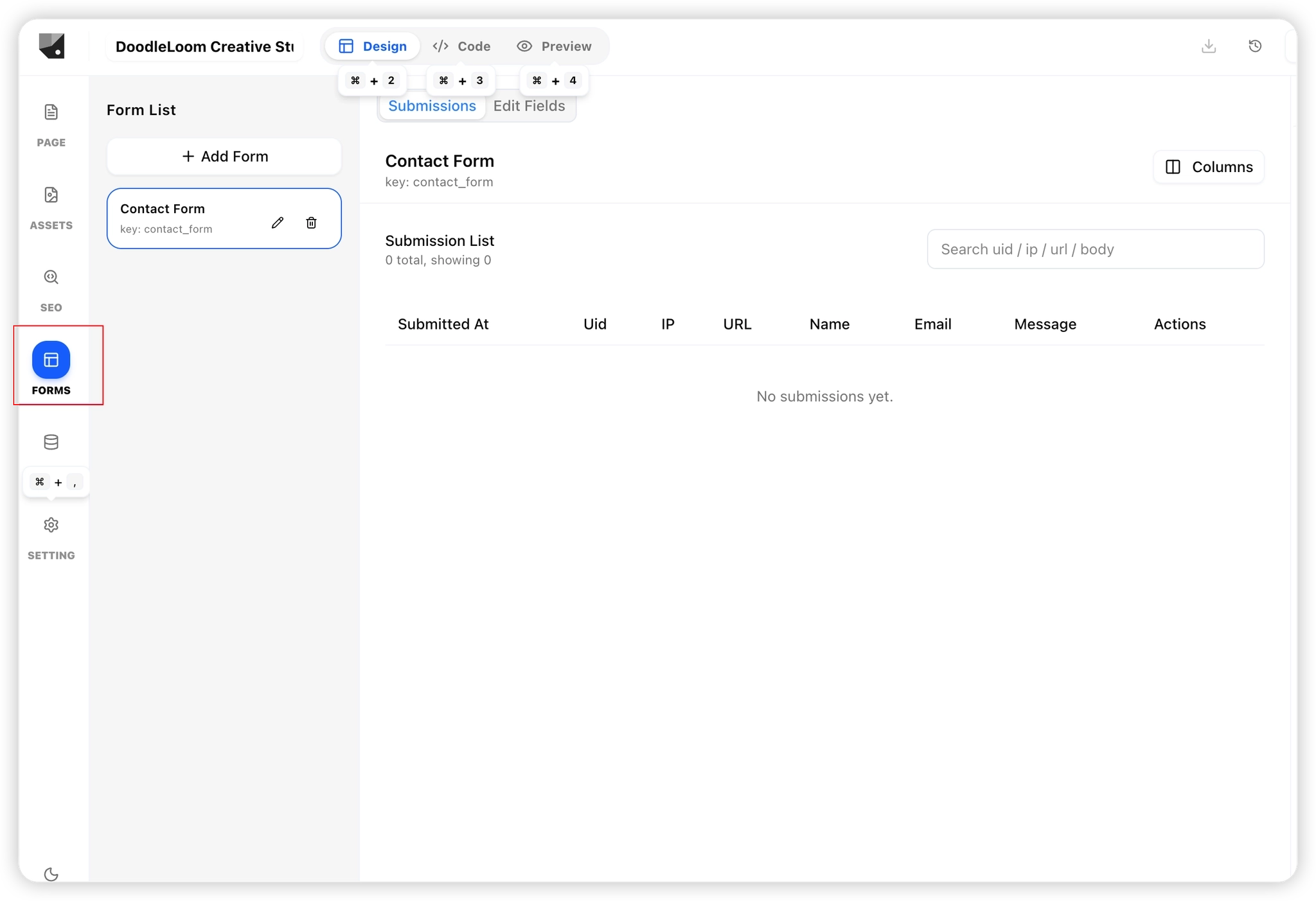 • View auto-generated forms (e.g., Contact Form) in the Forms Tab.