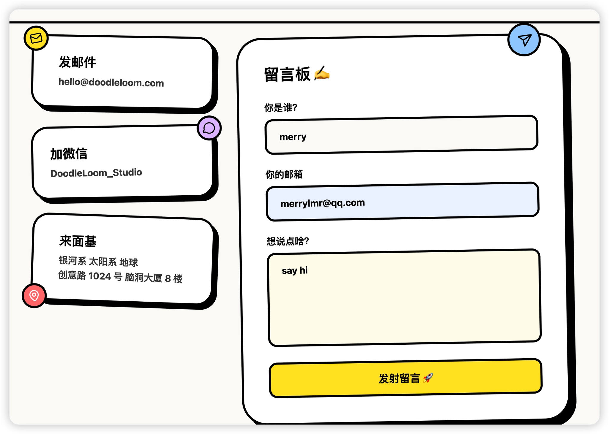 UI details: Rounded cards, thick borders Slight irregular / imperfect layout Fun, creative, friendly vibe